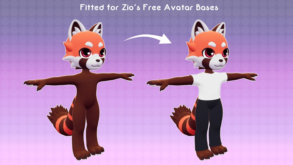 Give your avatar a T-shirt and pants! Easy installation with VRCFury for users of Zio's free VRC avatar bases. Donations welcome (help me get a VR headset ;u;). Interested in Zio's free avatars? You may check them out in my avatar world:
